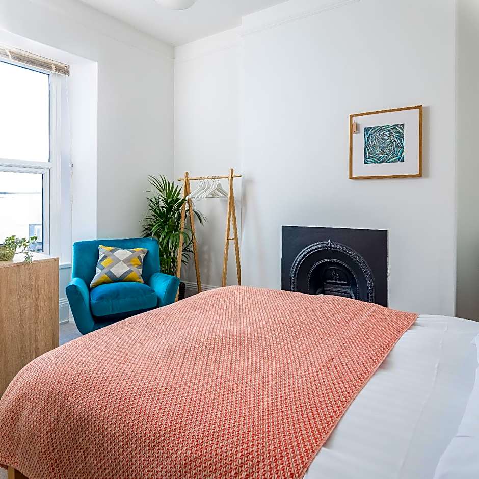 A first-floor large standard twin room with a double bed and a single bed and a Smart TV. The en-suite shower room has Cornish toiletries. Large bath sheets, hand towels and a hairdryer are also included.